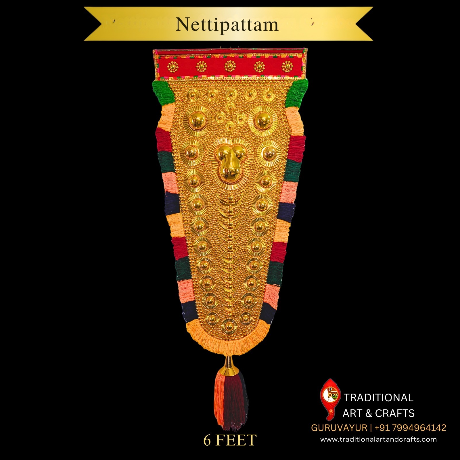 Experience the grandeur of Kerala tradition with our 6 feet handcrafted Nettipattam, meticulously made by skilled manufacturers of Nettipattam. Each piece reflects authentic craftsmanship, perfect for temples, home décor, and cultural events. Add royal elegance to your space with this majestic creation, symbolizing prosperity and devotion.