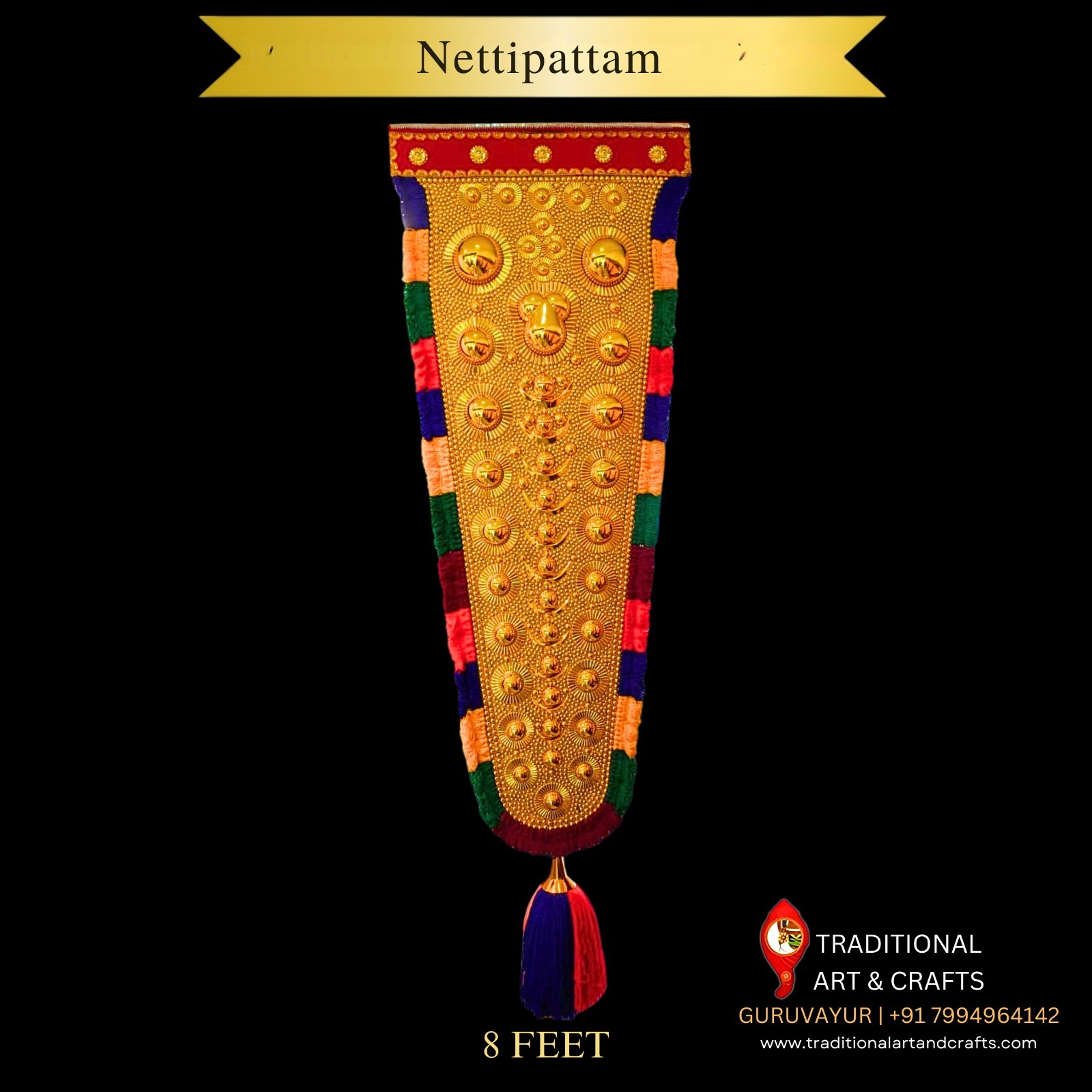 Nettipattam Wholesale Dealers – Bring home the grandeur of Kerala tradition with our 8 Feet Nettipattam, handcrafted by skilled artisans. Each piece reflects royal elegance and cultural heritage — perfect for temples, stage decorations, festivals, and premium home decor.