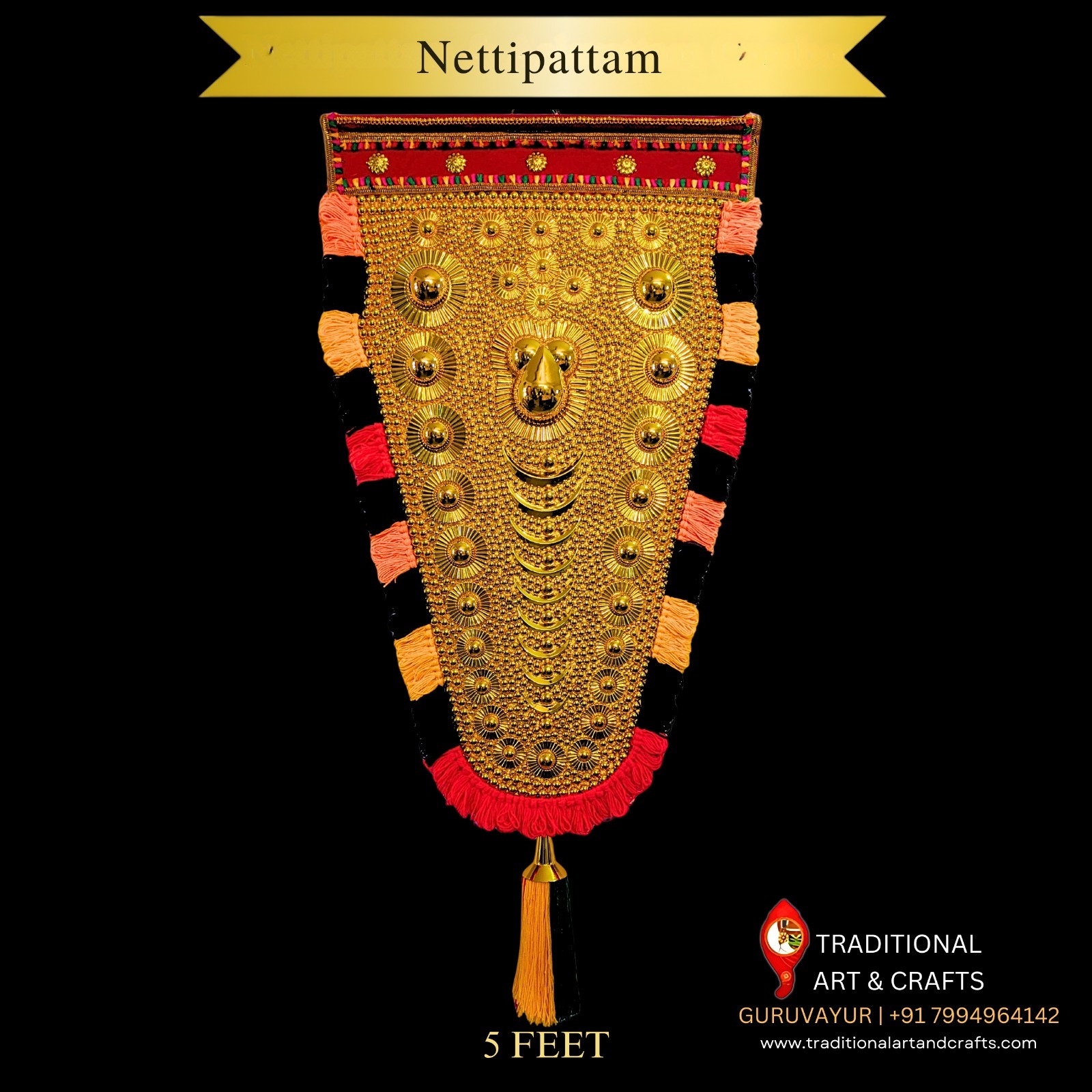 Wholesale Nettipattam Dealers in Guruvayur bring you this magnificent 5 Feet Nettipattam, handcrafted by skilled artisans using traditional techniques. Perfect for temple décor, home wall art, cultural events, or gifting. Experience Kerala’s heritage and craftsmanship in every piece.