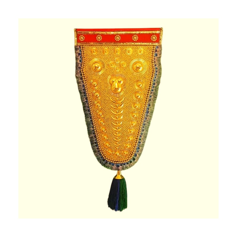 7 Feet Traditional Peacock Feather Nettipattam with beautiful golden area A traditional Nettipattam / Thalekettu / Anapattam / Elephant caparison embodies the rich cultural heritage of Kerala, India. It's a grand and ornate headgear primarily used to adorn elephants during temple festivals, processions, and other cultural celebrations. The Nettipattam is symbolic of majesty, grandeur, and tradition.It's a grand and ornate headgear primarily used to adorn elephants during temple festivals, processions, and other cultural celebrations. The Nettipattam is symbolic of majesty, grandeur, and tradition. A Nettipattam made in accordance with all traditions typically follows specific elements: 1. Material: Traditionally crafted using materials is gold or gold plated. But in , modern versions may use less expensive metals and it is plated colour of Gold. They are adorned with intricate designs, often featuring motifs from Kerala's cultural heritage. 2. Intricate Design: The design is usually elaborate and detailed, with artistic engravings and patterns that reflect the craftsmanship of skilled artisans. Traditional art and crafts makes it with all traditional features and it’s patterns are common. 3. Symbolic Significance: The Nettipattam symbolizes the dignity and cultural importance of elephants in Kerala and South India. It's not only an ornament but also holds symbolic value in festivals and ceremonies. 4. Colorful Embellishments: Some Nettipattams incorporate colorful stones, beads, or fabrics, adding vibrancy to the ornament and making it visually appealing during processions. To find a Nettipattam that truly embodies tradition, seeking authentic craftsmen or traditional artisanal markets in Kerala might be the best approach. However, online platforms specializing in traditional Indian handicrafts or cultural items may also offer options that adhere to traditional designs and crafting techniques. Always ensure authenticity and craftsmanship when looking for a Nettipattam with traditional elements.
