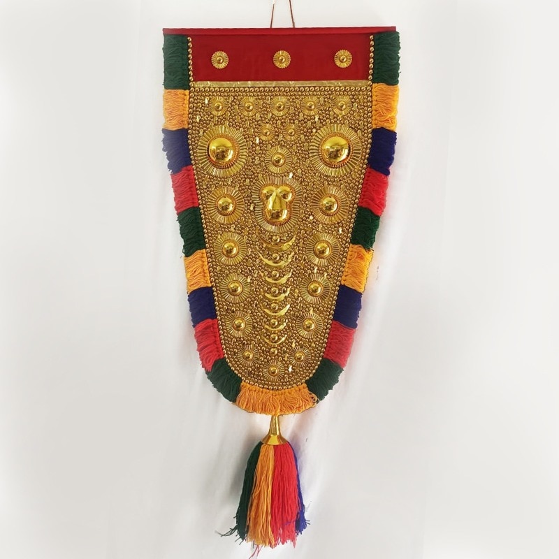 Decorative Nettipattam Elakkathali Model (Total Height 4 Feet) Nettipattam (Traditional Elephants Caparison in Malayalam നെറ്റിപ്പട്ടം) is a Kerala traditional handicraft, Which is used to decorate elephant in the time of festivals like pooram's. The gold colour of the Nettipattam makes its an eye-catching item during the Pooram festival. Different types of Nettipattam are available in our e-commerce Nettipattam is a glittering ornament and it adorns the forehead of an elephant. Earlier, Nettipattam was only used during festivals. In Kerala, elephants are decorated during the temple festivals. They wear a distinctive the golden head covering called a nettipattam, which is often translated into English as an elephant caparison. Legend has tells that the Nettipattam was designed by Lord Brahma. Iravath, the white elephant of Lord Indra Baghavan, was the first lucky elephant to wear Nettipattam It represents the entire pantheon of gods in Hinduism. Each bubble depicts Pancha-bhoothas Thrimoorthies, Navagrahas, Ashta-vasus, Saptarishis, Moola Ganapathi etc. So people believe that Nettipattam brings prosperity, peace and blessings. Nettipattam or Elephant caparisons is an essential item to decorate modern and traditional South Indian interior design. Customs and traditions of our country add glory to culture of our great nation . Temples , Rituals, Festivals, ultsavams , are the part the life of all Indians. Indians in every corner of the world have nostalgic memories of their country. So these handicrafts items like Nettipattam gives our guest rooms to create such an atmosphere in our visiting room or living rooms . Even the present generation who are unfamiliar with our tradition can get in touch with the culture of our country. Nettipattam is made with copper and pure gold is plating in it. Electro plated fibre Nettipattam is using for wall hanging. It is a trend to use it as a wall hangings in different sizes. Here we are offering you the Fiber Nettipattam with all its traditional scientific aspects. Nettipattam – Elephant caparison is not just a decoration. It is a great temple housing thirty three crore deities. Each of the golden orbs(beads) are the symbols and it represent different concept of God.