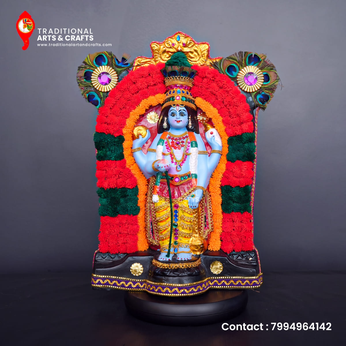 Traditional Art and Crafts provides beautiful lord krishna statues, murtis, idols and sculptures in different sizes, colors, styles and prices. Buy Online Now! We are into manufacturing of indian god idols made of fiber. We make top class Fiber idols with genuine materials and high efficient labors. We are located at Kerala, Guruvayur and have clients from all over India and even abroad. This guruvayurappens idol is made with fibre and surrends set by woolen in colour red and green (Guruvayur temple mala colour is red and green-- thechi and thulasi are using to decorate krishna idol)