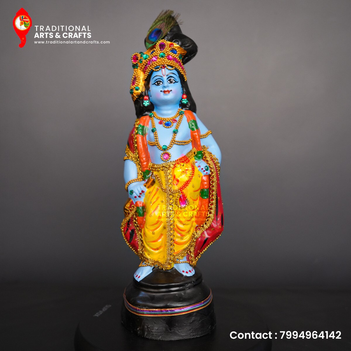 Traditional Art and Crafts provides beautiful lord krishna statues, murtis, idols and sculptures in different sizes, colors, styles and prices. Buy Online Now! We are into manufacturing of indian god idols made of fiber. We make top class Fiber idols with genuine materials and high efficient labors. We are located at Kerala, Guruvayur and have clients from all over India and even abroad.This vittappa krishna is made with fibre and with height 18 inch