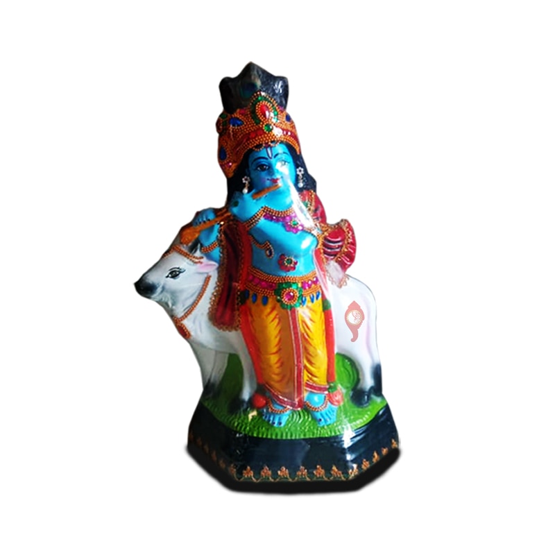 Krishna with cow made with fibre Krishna with cow idol made with fibre Krishna, revered as the eighth incarnation of Vishnu, embodies the essence of truth, devotion, love, and joy. His presence on earth is marked by a deeply human character, capturing hearts with stories of his playful mischief in childhood and his irresistible charm as a young man. Renowned for his enchanting flute music, Krishna was adored by both young and old. This statue is a beautiful and rare antique reproduction made from high-quality resin, expertly handcrafted and carved by traditional artisans. The artistry involved is exceptional, showcasing a level of detail that is rarely seen and can only be achieved by master craftsmen. The quality of the piece is unmatched, and in person, its beauty is even more striking.