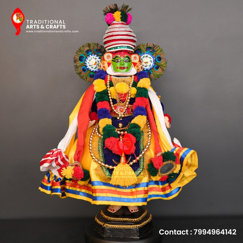 Krishnanattam Dolls 30 Inch, main body is made with fibre and other costumes are made with silk cloth and woolen and alavattam and fibre ornaments. Krishnattam and Kathakali are two classical dance-drama forms from Kerala, India, known for their elaborate costumes, vivid makeup, and expressive performances. Dolls representing characters from these art forms are popular for their vibrant and intricate designs. Origin: Krishnattam is a dance-drama that narrates the stories of Lord Krishna, originating in the 17th century under the patronage of the Zamorin of Calicut. Features: Krishnattam dolls are dressed in traditional costumes that depict various episodes from the life of Krishna. They often feature brightly colored attire, elaborate headgear, and facial makeup that is less elaborate than Kathakali but equally expressive.
