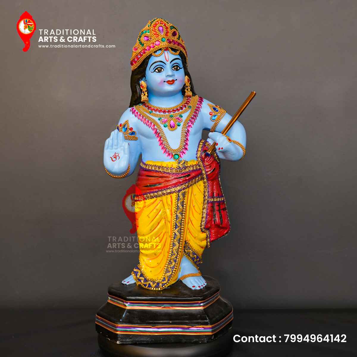 Traditional Art and Crafts provides beautiful lord krishna statues, murtis, idols and sculptures in different sizes, colors, styles and prices. Buy Online Now! We are into manufacturing of indian god idols made of fiber. This ashirwad krishna is with height 3 feet We make top class Fiber idols with genuine materials and high efficient labors. We are located at Kerala, Guruvayur and have clients from all over India and even abroad. This beautiful Krishna idol, crafted by artisans in Kerala, brings goodness and positivity to your home and life. Lord Krishna is a major deity worshipped in many different forms. He is often seen as the "Svayam Bhagavan," or the complete incarnation of Lord Vishnu. Krishna is one of the most widely revered and popular Hindu deities, also known by names like Govinda, Mukunda, Madhusudhana, and Vasudeva.
