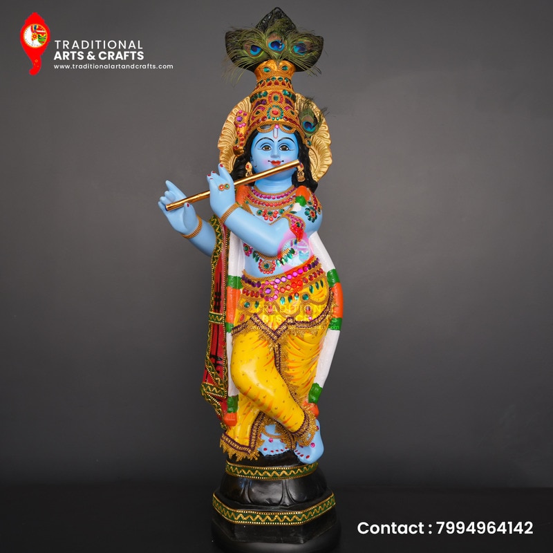 Traditional Art and Crafts presenting our Divine Harmony Lord Krishna Idol, a 33-inch masterpiece crafted with accuracy and commitment. Buy Online Now! This heavenly figurine is made using top notch fiber material. We ensure durability, strength, lightness, and a stunning finish that will grace any sacred space with elegance. Key Features: Material: Crafted from premium fiber material, this idol combines the timeless elegance of Lord Krishna's form with modern durability. Height: Standing at an impressive 33 inches, this idol orders consideration and becomes a centre of attraction in any worship area or home decor. Intricate Details: Meticulously designed to capture the divine essence, the idol features deep detailing on Lord Krishna's attire, ornaments, and divine accessories. Color Palette: The idol is enhanced with vibrant and harmonious colors that complement each other, enhancing the visual appeal and spiritual significance of the deity. Symbolic Poses: Lord Krishna is depicted in a symbolic pose, releasing peacefulness, love, and wisdom. The pose chosen for this idol is a timeless representation of the divine connection between the deity and its devotees. Adaptability: Suitable for both indoor and outdoor use, this idol can be placed in your home, temple, meditation space, or garden, radiating positive energy and fostering a sense of serenity. Easy Maintenance: The fibre material ensures easy maintenance, allowing you to enjoy the divine presence without the worry of wear and tear. Ideal Gift: Perfect for gifting on auspicious occasions, housewarmings, weddings, or religious ceremonies, this Lord Krishna idol symbolizes blessings, protection, and divine grace.