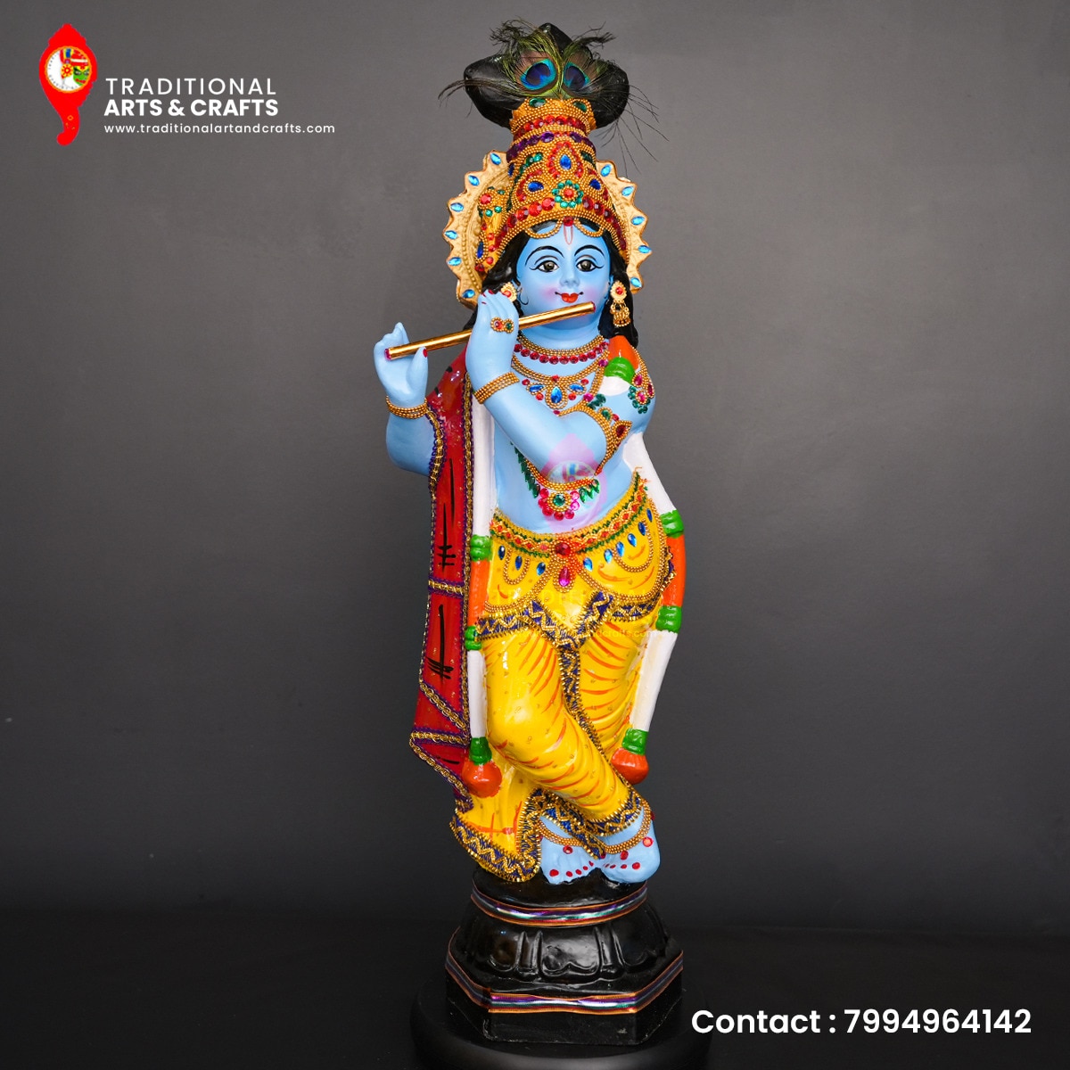 Traditional Art and Crafts presenting our Divine Harmony Lord Krishna Idol, a 33-inch masterpiece crafted with accuracy and commitment. Buy Online Now! This heavenly figurine is made using top notch fiber material. We ensure durability, strength, lightness, and a stunning finish that will grace any sacred space with elegance. Key Features: Material: Crafted from premium fiber material, this idol combines the timeless elegance of Lord Krishna's form with modern durability. Height: Standing at an impressive 33 inches, this idol orders consideration and becomes a centre of attraction in any worship area or home decor. Intricate Details: Meticulously designed to capture the divine essence, the idol features deep detailing on Lord Krishna's attire, ornaments, and divine accessories. Color Palette: The idol is enhanced with vibrant and harmonious colors that complement each other, enhancing the visual appeal and spiritual significance of the deity. Symbolic Poses: Lord Krishna is depicted in a symbolic pose, releasing peacefulness, love, and wisdom. The pose chosen for this idol is a timeless representation of the divine connection between the deity and its devotees. Adaptability: Suitable for both indoor and outdoor use, this idol can be placed in your home, temple, meditation space, or garden, radiating positive energy and fostering a sense of serenity. Easy Maintenance: The fibre material ensures easy maintenance, allowing you to enjoy the divine presence without the worry of wear and tear. Ideal Gift: Perfect for gifting on auspicious occasions, housewarmings, weddings, or religious ceremonies, this Lord Krishna idol symbolizes blessings, protection, and divine grace. Bundle Includes: 1 x 33-Inch Lord Krishna Idol (Fiber Material) Note: Every icon is hand tailored with care, and slight varieties might happen, adding a one-of-a-kind touch to each piece. “Bring back the essence of heavenly nature with our Divine Harmony Lord Krishna Idol - an image of harmony, love, and eternal wisdom. Order now and invite the heavenly presence into your holy space.”