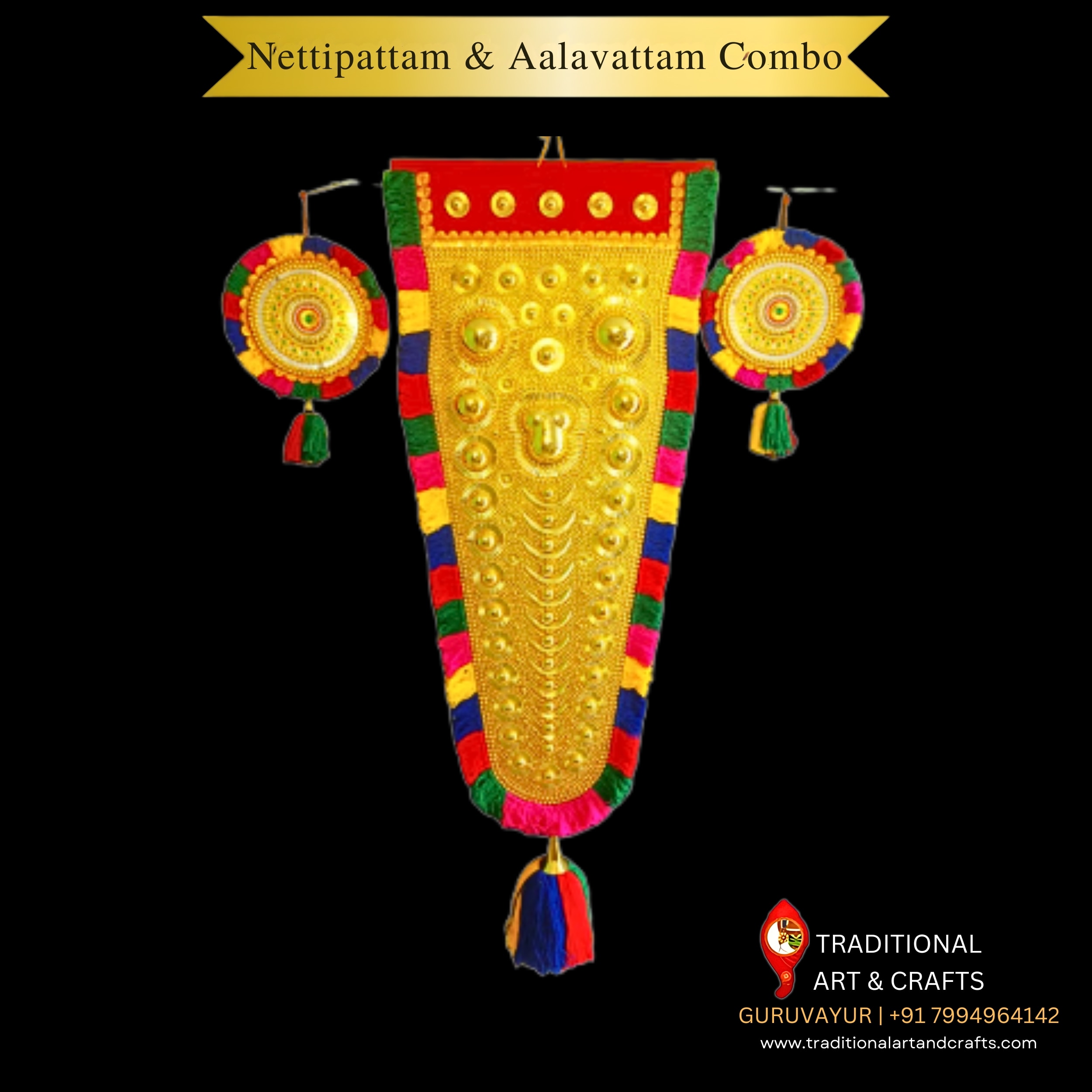 Kerala’s traditional 8-feet Nettipattam and Aalavattam combo, a true masterpiece of craftsmanship and cultural pride. This large, visually stunning set is scientifically handcrafted in Kerala by skilled artisans, blending heritage artistry with a premium gold finish. The 8-feet Nettipattam with colorful Kathakali-style Aalavattams, creating an display ideal for temples, pooja rooms, cultural events, festivals, and decorative spaces. Its impressive size and detailing make it a centerpiece of devotion and elegance. Perfect for those seeking to create an authentic spiritual ambiance, this combo also suits retail shops looking to stock premium Kerala traditional art pieces. Available in various sizes, the 8-feet combo stands as a timeless addition to your collection of heritage decor.