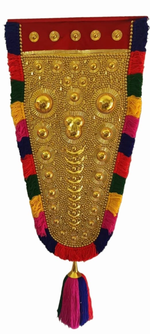 Nettipattam (Traditional Elephants Caparison in Malayalam നെറ്റിപ്പട്ടം) is a Kerala traditional handicraft, Which is used to decorate elephant in the time of festivals like pooram's. The gold colour of the Nettipattam makes its an eye-catching item during the Pooram festival. Different types of Nettipattam are available in our e-commerce Nettipattam is a glittering ornament and it adorns the forehead of an elephant. Earlier, Nettipattam was only used during festivals. In Kerala, elephants are decorated during the temple festivals. They wear a distinctive the golden head covering called a nettipattam, which is often translated into English as an elephant caparison. Legend has tells that the Nettipattam was designed by Lord Brahma. Iravath, the white elephant of Lord Indra Baghavan, was the first lucky elephant to wear Nettipattam It represents the entire pantheon of gods in Hinduism. Each bubble depicts Pancha-bhoothas Thrimoorthies, Navagrahas, Ashta-vasus, Saptarishis, Moola Ganapathi etc. So people believe that Nettipattam brings prosperity, peace and blessings. Nettipattam or Elephant caparisons is an essential item to decorate modern and traditional South Indian interior design. Customs and traditions of our country add glory to culture of our great nation . Temples , Rituals, Festivals, ultsavams , are the part the life of all Indians. Indians in every corner of the world have nostalgic memories of their country. So these handicrafts items like Nettipattam gives our guest rooms to create such an atmosphere in our visiting room or living rooms . Even the present generation who are unfamiliar with our tradition can get in touch with the culture of our country. Nettipattam is made with copper and pure gold is plating in it. Electro plated fibre Nettipattam is using for wall hanging. It is a trend to use it as a wall hangings in different sizes. Here we are offering you the Fiber Nettipattam with all its traditional scientific aspects. Nettipattam – Elephant caparison is not just a decoration. It is a great temple housing thirty three crore deities. Each of the golden orbs(beads) are the symbols and it represent different concept of God. Moolaganapati, Trimurtis, Saraswati, Lakshmi, Parvati, Sapta Rishis, Vishwamitra, Vishwakarma, Navagrahas and Ashtavasus. Moonbeams (Chandrakala) represents Sivasankalpa. According to the Vedas, 33 types of deities are worshiped by those who believe in Sanatana Dharma. Those deities are 12 Adityas, 11 Rudras, Ashtavasus, Indra and Prajapati. Adityas are 12 solar months and 12 levels of social life. The Ashtavasus are the 8 root deities who represent the different levels of nature. As per your preference, the vibrant brows are completely handcrafted in different sizes. You can select it as per your spice and size suitable for home or institutions. Contact us for quality original turbans (Elaphant caparison) and wall hanging nettipattams Earlier, Nettipattam was only used during festivals only. Today, it is a trend to use it as wall hangings in different sizes. The Traditional Nettipattam is made in copper and pure gold is plating in it. Now plastic & fibre Nettipattam's are available in market. Here we are offering you the Fiber Nettipattam from traditional crafts man in God's own country. It is ideal to be used in offices, homes and is also ideal to be presented as a gift to dear ones. The materials required are jute material, Jagathnath cloth (thick cotton cloth locally called), leather forms and the red cotton cloth material cut to the forehead length and width. Wholesale and Retail Available, and we can send it by courier to all over the world