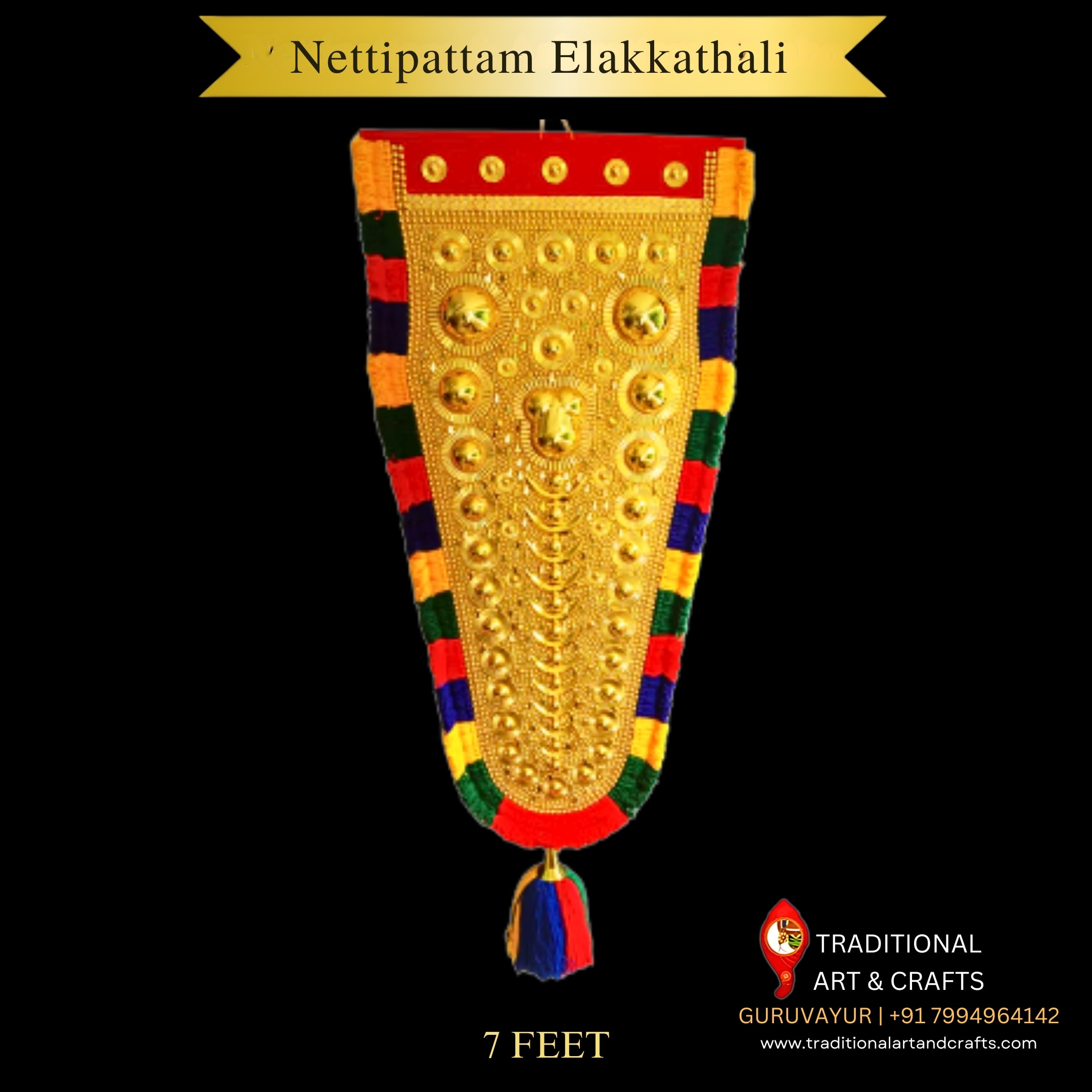 At the very center of Kerala's temple heritage, the Nettipattam, or the regal elephant caparison, stands as an object of sacred reverence. It is said that this divine ornament was actually designed by Lord Brahma himself, the Nettipattam is said to be the visual representation of the 33 crore gods who are worshipped in Sanatana Dharma, each golden globe on its surface representing potent cosmic forces such as the Pancha Bhoothas, Navagrahas, Ashtavasus, Sapta Rishis, and the Trimurtis — Brahma, Vishnu, and Maheshwara. Our 7 Feet Nettipattam adorned with colorful Elakkathali is a celebration of this sacred tradition, lovingly created by the skilled craftsmen of God's Own Country, Kerala. this glorious Nettipattam occupies pride of place in homes, offices, and places of worship, and gifts not merely as a decoration but as an emblem of prosperity, divine favor, and eternal tradition. Each is handcrafted with precision using high-quality fiber with a lustrous golden finish to retain the traditional elements and holy geometry. Placed in a pooja room, reception hall, or presented as a gift to someone special, this 7 Feet Nettipattam with Elakkathali converts any room into a haven, blessings, and resplendent cultural pride, retaining that holy connection between the heavens and our homes. We are servicing all India free and safe delivery.and also supply to all retail shops in wholesale price.
