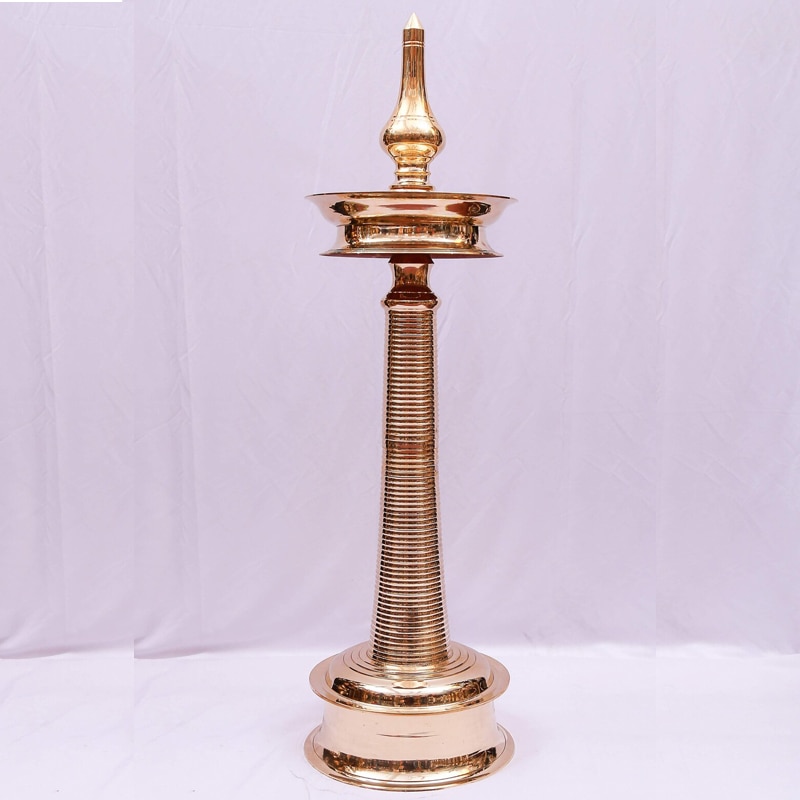 Nilavilakku Traditional art and crafts presenting our staggering 5-foot Nilavilakku, a delightful lamp that blends classic charm with modern design. Made from high-quality brass, it flaunts a sparkling gold completion that adds a bit of luxury to any space. Great Height: Remaining at a lofty 5 feet (60 inches), our Nilavilakku orders attention, making it a striking focal point for any space. Dazzling Craftsmanship: Carefully created from high-quality brass, the light flaunts a radiant brilliant golden finish, exhibiting mind boggling designs and fancy itemizing that tells a story of ages of gifted masterfulness. Amicable Plan: The light's slim outline is embellished with fragile themes propelled by custom, accomplishing an outstanding combination of traditional style and current plan sensibilities. Solid Groundwork: Laying on a powerful base, the Nilavilakku dazzles with its visual beauty as well as guarantees steadiness and sturdiness, making it reasonable for different events. Dual Purpose: When lit, the Nilavilakku radiates a warm, welcoming sparkle that highlights its definite examples, making an entrancing play of light and shadows in your space. Cultural Symbolism: Beyond its aesthetic charm, this lamp holds cultural importance, addressing tradition, spirituality, and the enduring tradition of craftsmanship. Flexible Usage: Ideal for strict services, celebrations, or as a dazzling stylistic layout piece, the Nilavilakku rises above its job as a simple light to turn into an image of social pride. Level as Imagery: The light's transcending 5-foot level isn't simply physical; it represents otherworldly climb, raising the feeling of any room it graces. Living Heritage: Bring home the Nilavilakku to implant your space with a brilliant epitome of custom, spirituality, and the immortal magnificence of cultural craftsmanship. Enlighten your environmental elements with something beyond light - let it recount to the rich story woven into every last bit of this dazzling work of art.