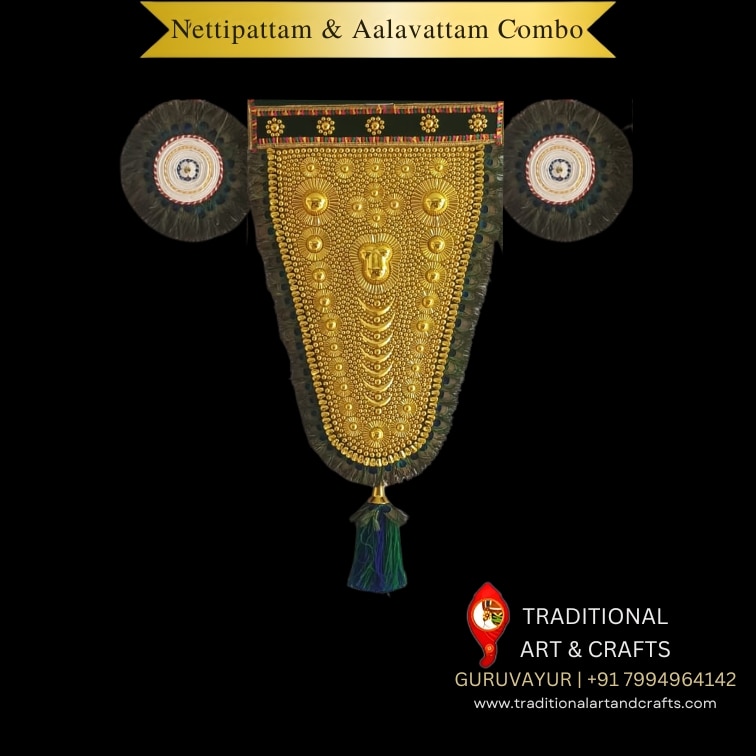 With this gorgeous Nettipattam & Aalavattam Combo, you can bring the splendor of Kerala temple customs into your home. This exquisite set, which was handcrafted by talented artisans in Guruvayur, includes a pair of peacock feather Aalavattams that symbolize divine majesty and a magnificent golden Nettipattam with intricate detailing. It exudes spiritual charm and cultural pride and is ideal for temple decoration, home decor, cultural events, and festive displays. Features: Genuine handcrafted artwork Superior quality materials Perfect for decor or gifts produced in Kerala's Guruvayur