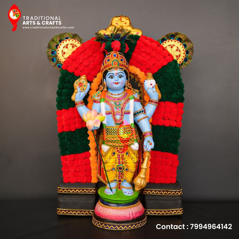 3 feet Height Lord Guruvayurappen Idol made with fibre Traditional Arts and Crafts presents a new addition to its collection of Krishna idols: the Vanamala Krishnan Idol. This exquisite representation of Guruvayurappan, the revered deity of the Guruvayur Temple, holds deep spiritual significance, attracting countless devotees from around the world for darshan (sacred viewing) and prayer. The temple is renowned for its strict adherence to customs and rituals, ensuring the purity and sanctity of worship dedicated to Guruvayurappan.