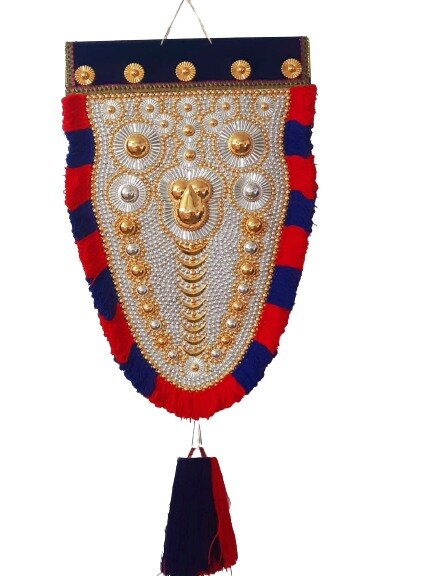 Wall Hanging Nettipattam Special Work (Total Height 4 Feet) Decorate your home with the highly auspicious Wall Hanging Nettippattam, a symbol of divine presence and prosperity. Embrace the rich cultural heritage of India with this stunning piece that promises to bring blessings and success to your home. Immerse yourself in the rich cultural heritage of Kerala with our exquisite Nettipattam. Handcrafted by skilled artisans, each Wall Hanging Nettipattam is a masterpiece of intricate designs, shimmering gold, and silver work, reflecting the opulence of Kerala's royal past. We take pride in using premium raw materials to ensure that each Nettipattam is not only stunning in appearance but also long-lasting and durable. Every detail is meticulously considered, from material selection to precision craftsmanship, guaranteeing a piece that will enhance your space for years to come. Our Nettipattam is designed for convenience, offering easy handling and foldability without sacrificing its regal allure. Whether adorning a ceremonial elephant or gracing a traditional procession, our Nettipattam exudes majesty and grandeur, capturing the vibrant essence of Kerala's culture. Embrace the elegance and tradition of Kerala with our Wall Hanging Nettipattam, and let it bring a touch of divine beauty and prosperity into your home.
