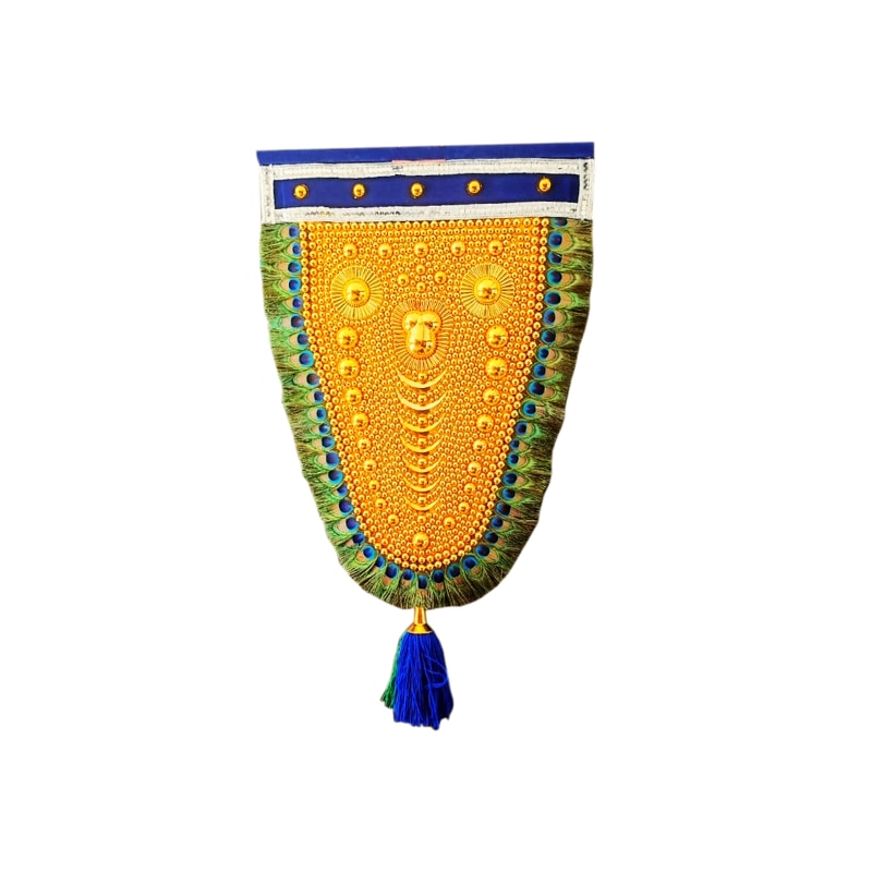 Wall Hanging Nettipattam with Peacock Fether A traditional Nettipattam / Thalekettu / Anapattam / Elephant caparison embodies the rich cultural heritage of Kerala, India. It's a grand and ornate headgear primarily used to adorn elephants during temple festivals, processions, and other cultural celebrations. The Nettipattam is symbolic of majesty, grandeur, and tradition.It's a grand and ornate headgear primarily used to adorn elephants during temple festivals, processions, and other cultural celebrations. The Nettipattam is symbolic of majesty, grandeur, and tradition. A Nettipattam made in accordance with all traditions typically follows specific elements: 1. Material: Traditionally crafted using materials is gold or gold plated. But in , modern versions may use less expensive metals and it is plated colour of Gold. They are adorned with intricate designs, often featuring motifs from Kerala's cultural heritage. 2. Intricate Design: The design is usually elaborate and detailed, with artistic engravings and patterns that reflect the craftsmanship of skilled artisans. Traditional art and crafts makes it with all traditional features and it’s patterns are common. 3. Symbolic Significance: The Nettipattam symbolizes the dignity and cultural importance of elephants in Kerala and South India. It's not only an ornament but also holds symbolic value in festivals and ceremonies. 4. Colorful Embellishments: Some Nettipattams incorporate colorful stones, beads, or fabrics, adding vibrancy to the ornament and making it visually appealing during processions. To find a Nettipattam that truly embodies tradition, seeking authentic craftsmen or traditional artisanal markets in Kerala might be the best approach. However, online platforms specializing in traditional Indian handicrafts or cultural items may also offer options that adhere to traditional designs and crafting techniques. Always ensure authenticity and craftsmanship when looking for a Nettipattam with traditional elements.
